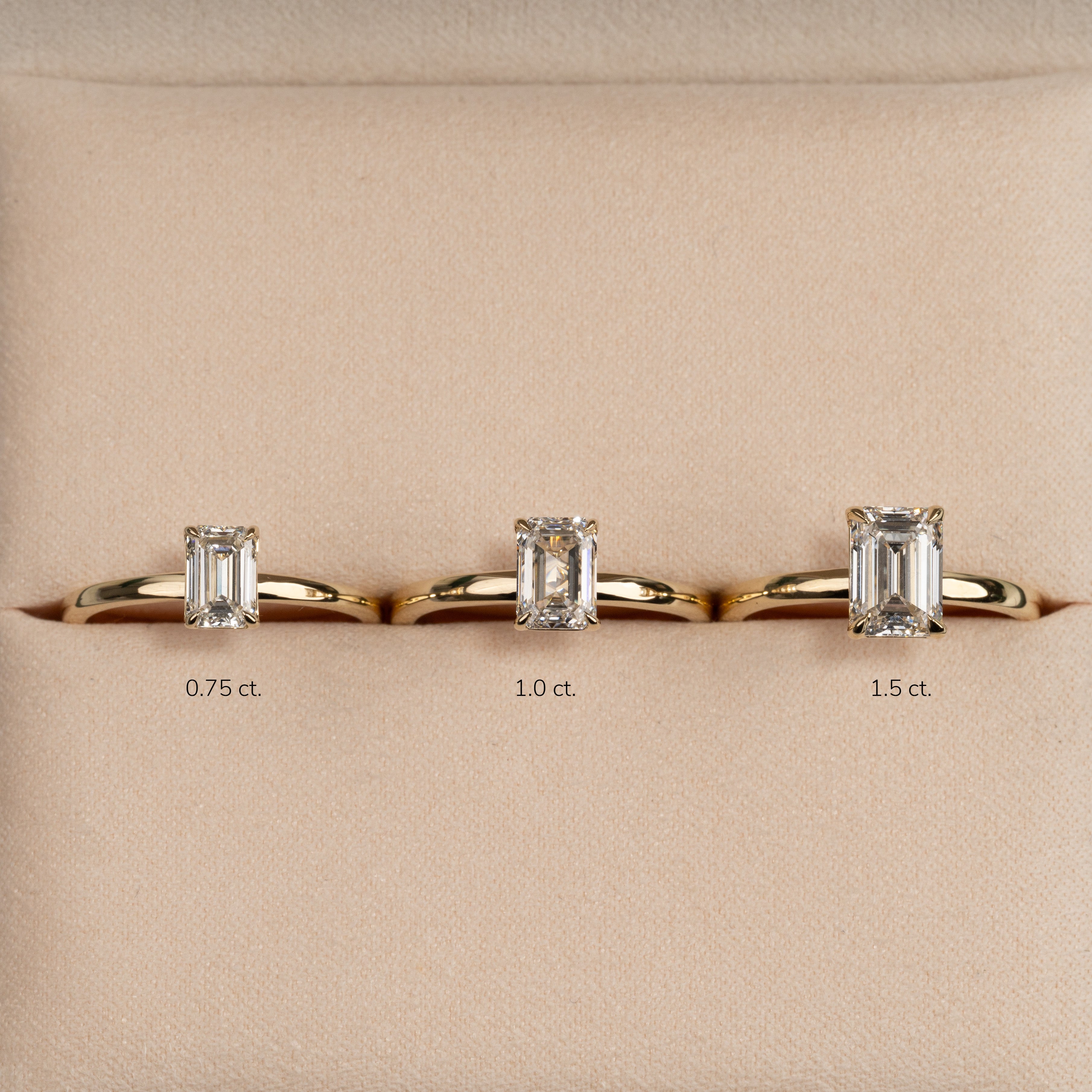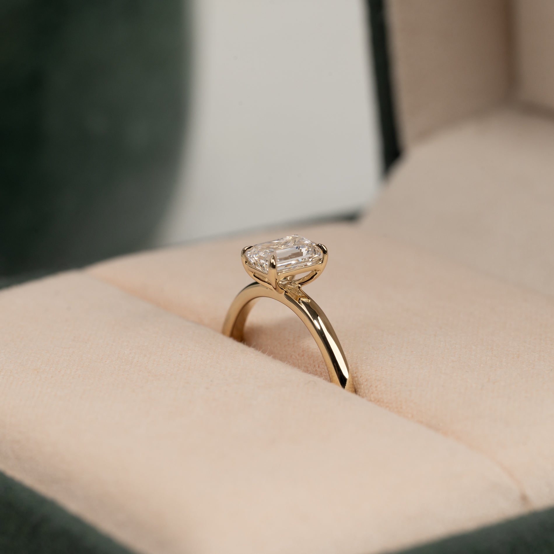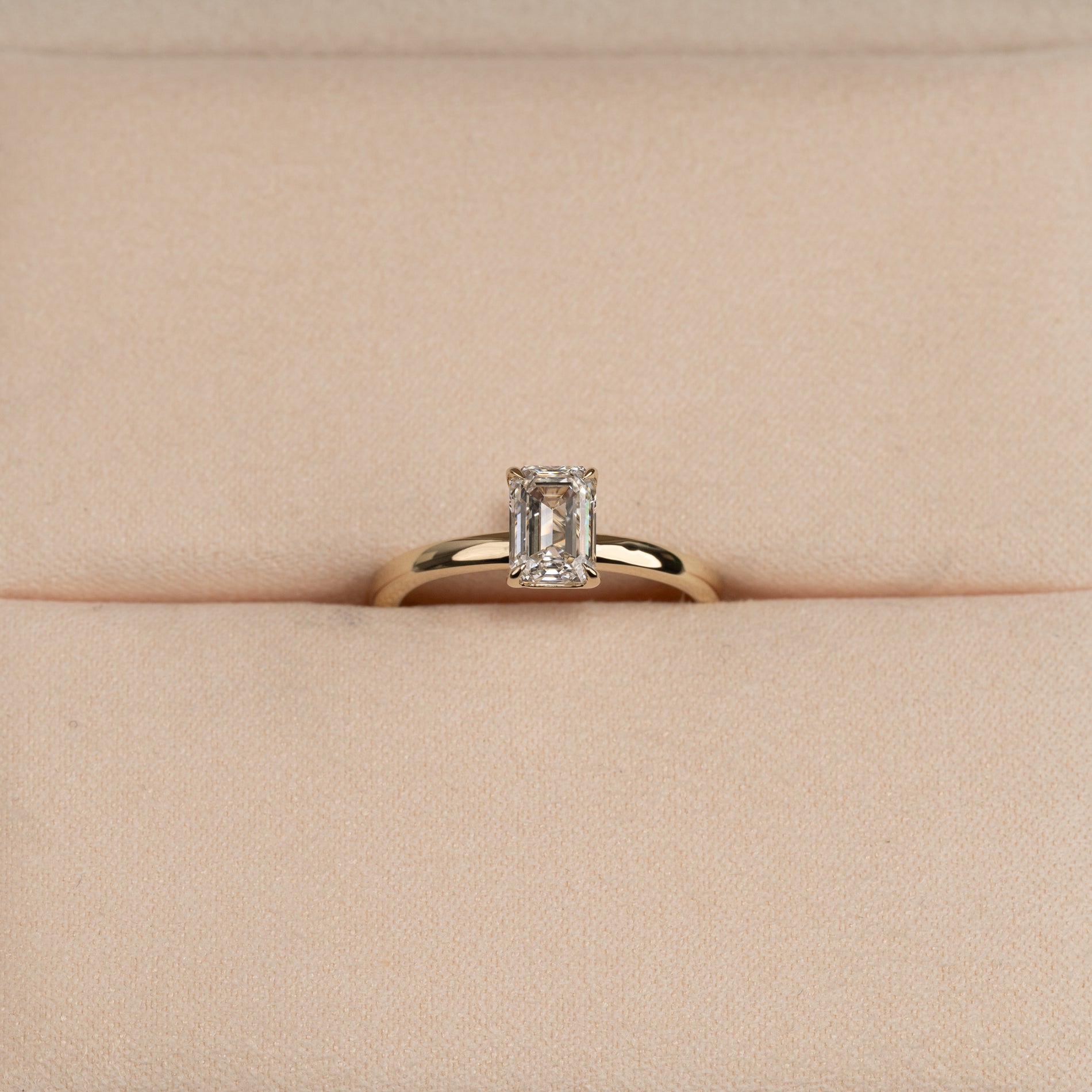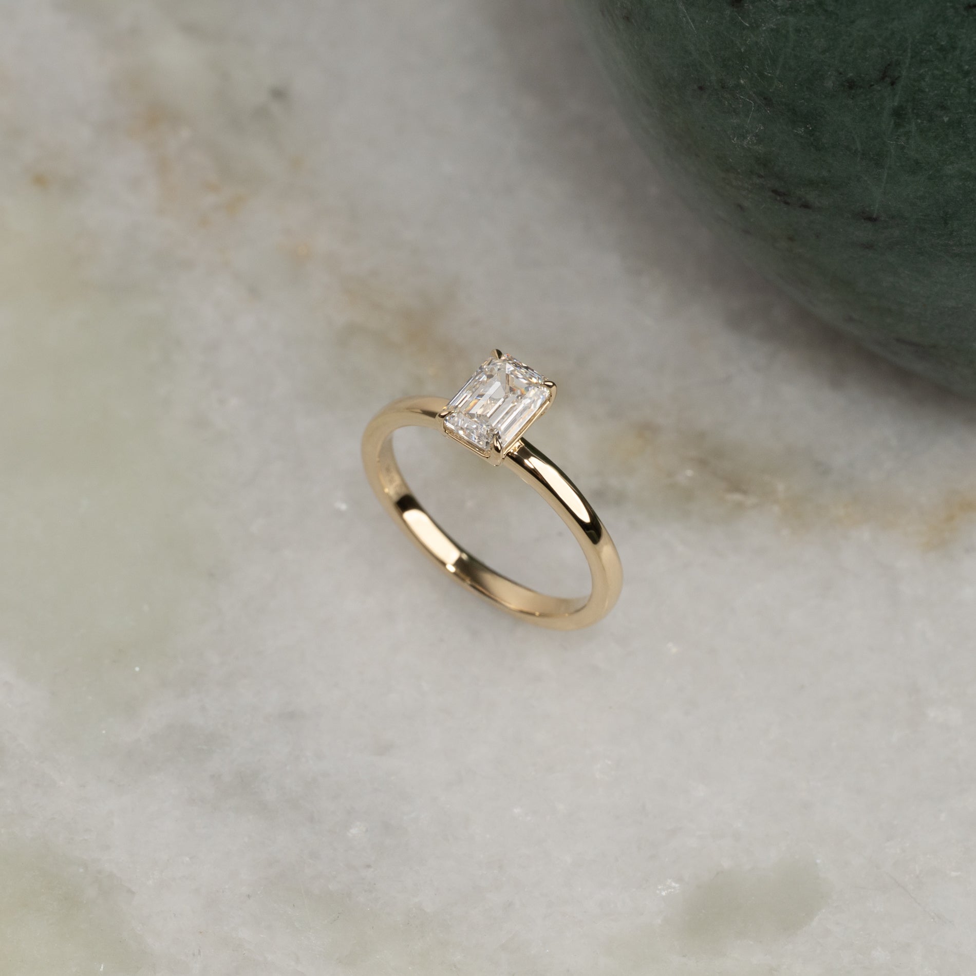 En tidløs ring i 14 karat guld med en smuk emerald‑slebet lab‑grown diamant på 1,0 ct. Diamanten er elegant fattet i en let hævet basket-fatning, der komplimenterer den klare, spejlende glans og de karakteristiske trappeformede facetter, der kendetegner emerald‑cut.