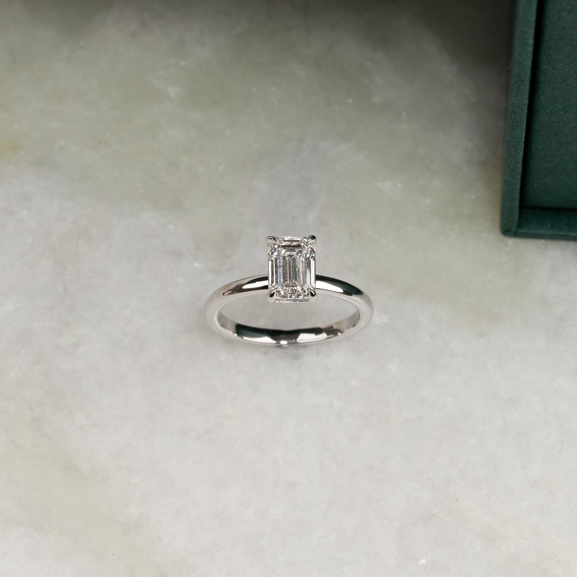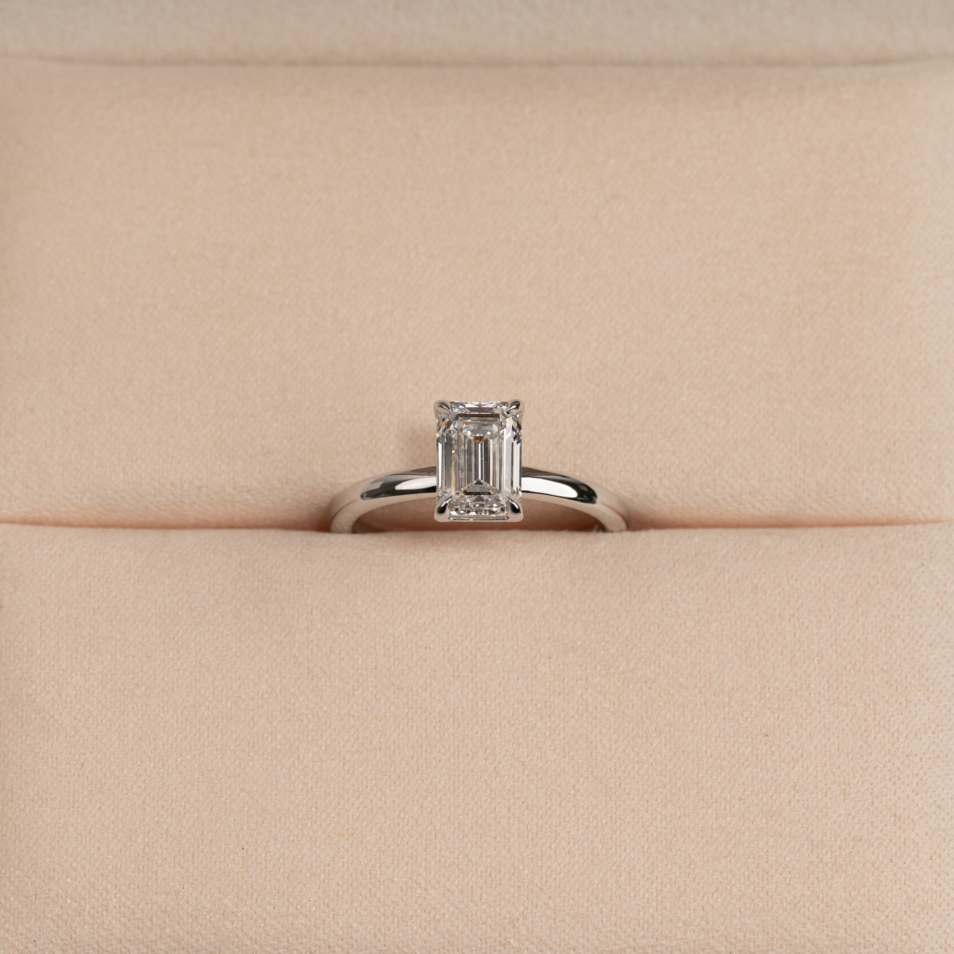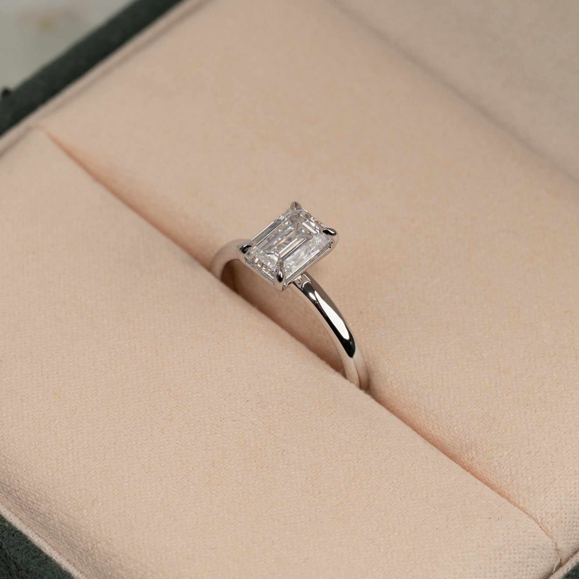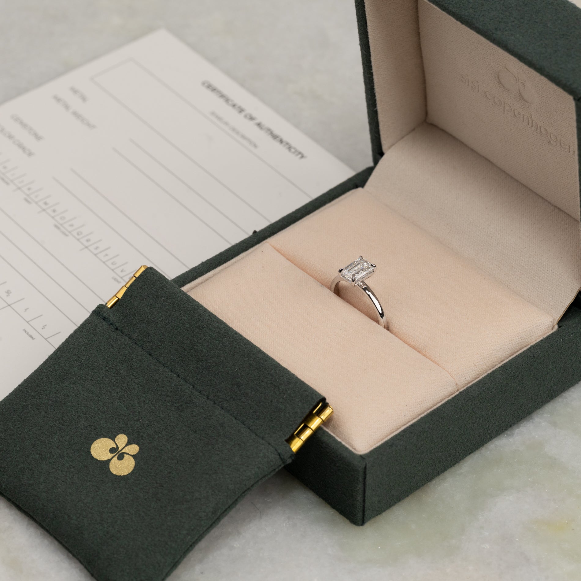 En tidløs ring i 14 karat hvidguld med en smuk emerald‑slebet lab‑grown diamant på 1,5 ct. Diamanten er elegant fattet i en let hævet basket-fatning, der komplimenterer den klare, spejlende glans og de karakteristiske trappeformede facetter, der kendetegner emerald‑cut.