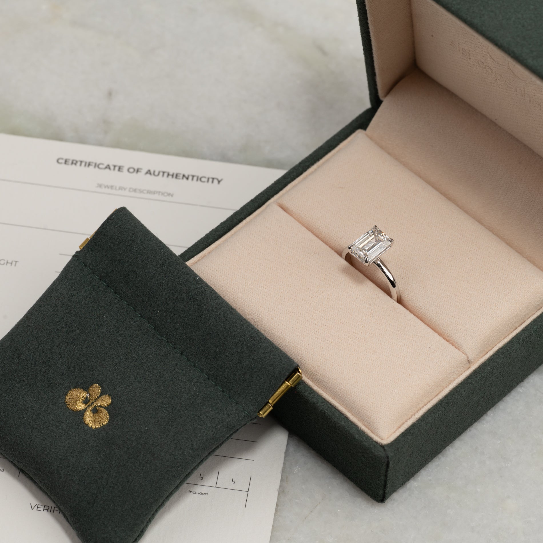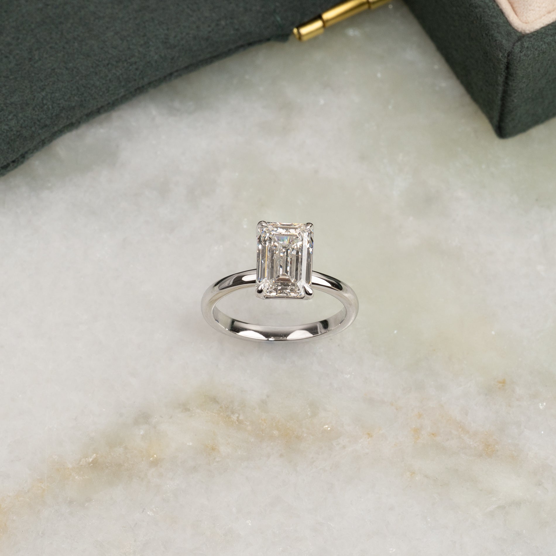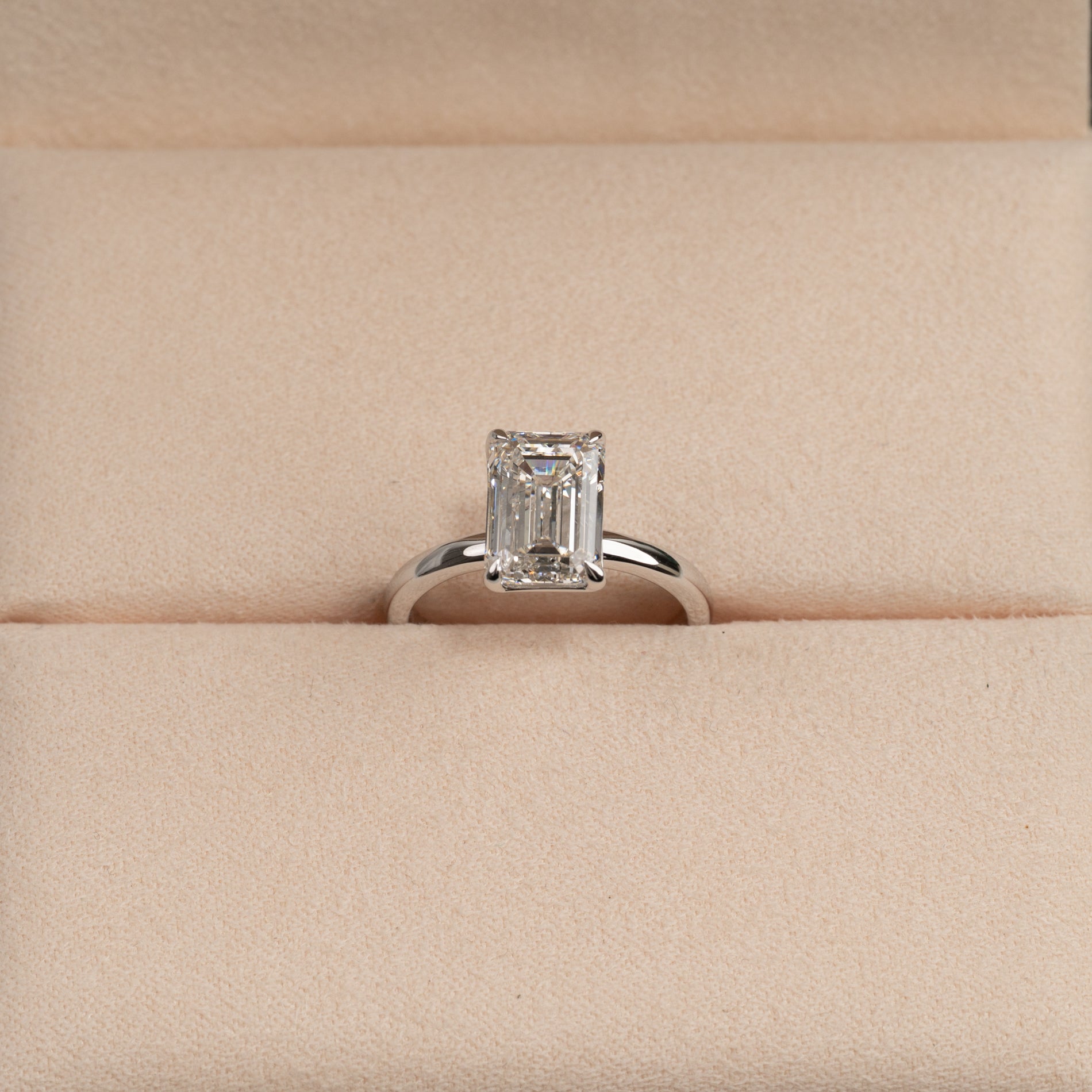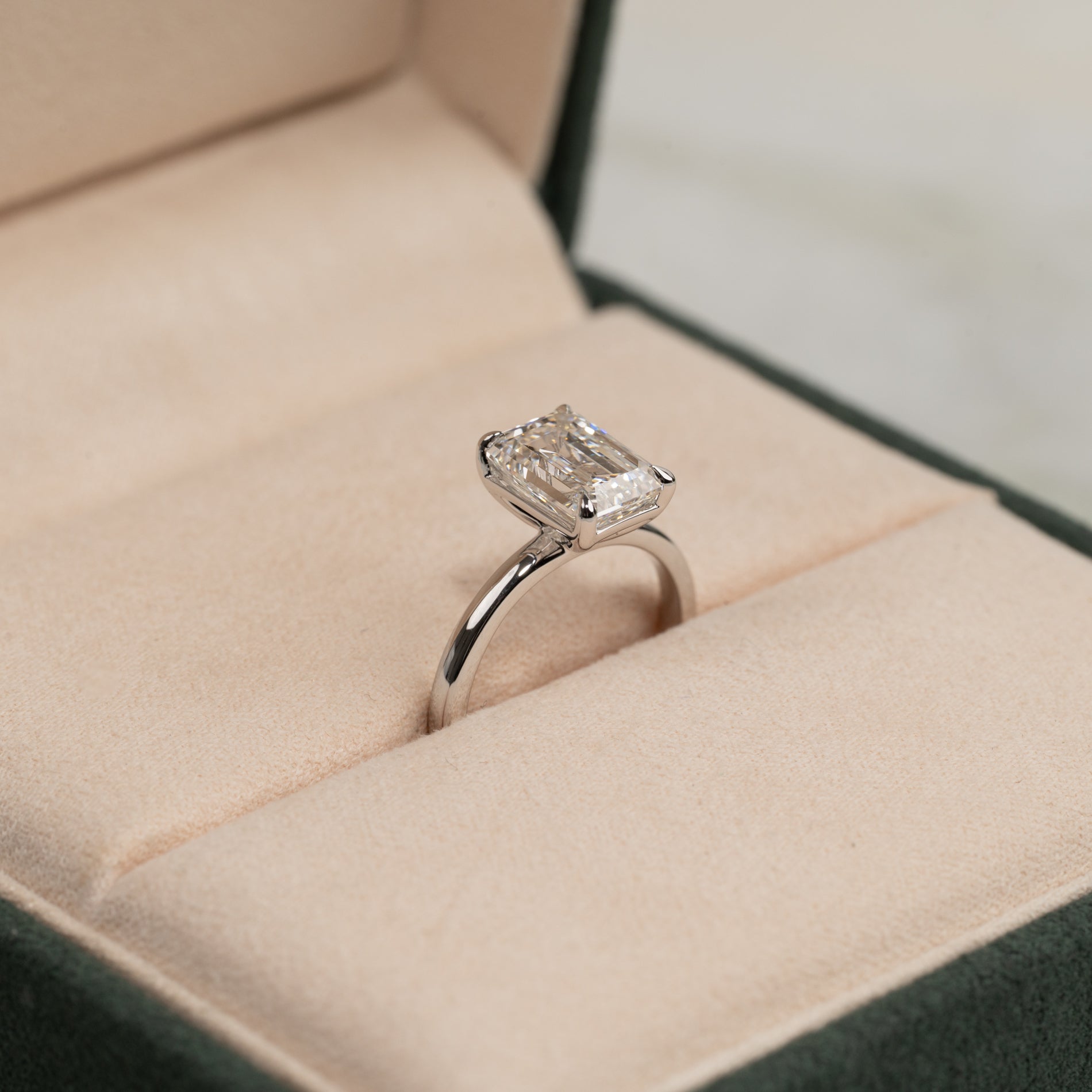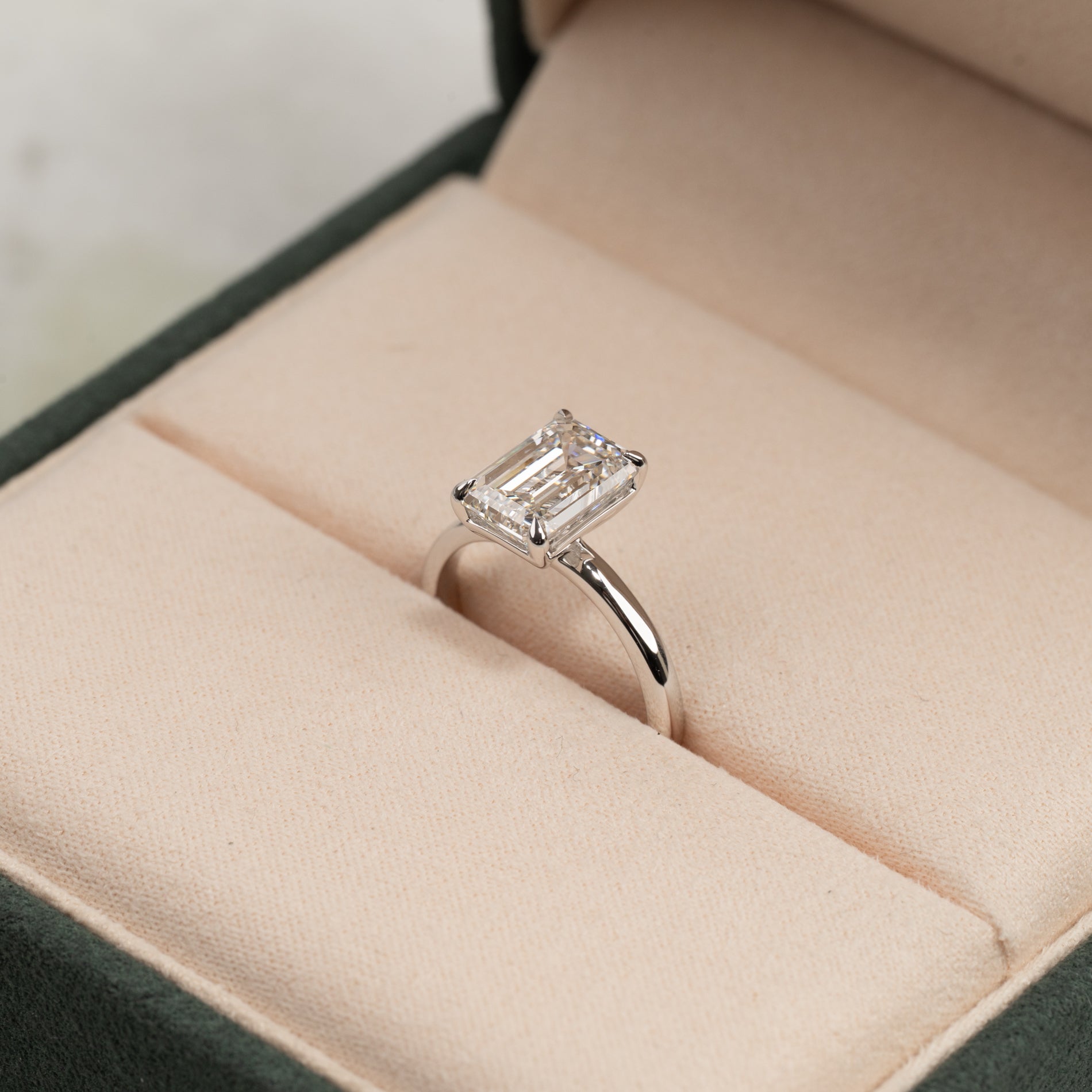 En tidløs ring i 14 karat hvidguld med en smuk emerald‑slebet lab‑grown diamant på 3,0 ct. Diamanten er elegant fattet i en let hævet basket-fatning, der komplimenterer den klare, spejlende glans og den karakteristiske trappefacettering, der kendetegner emerald‑cut.