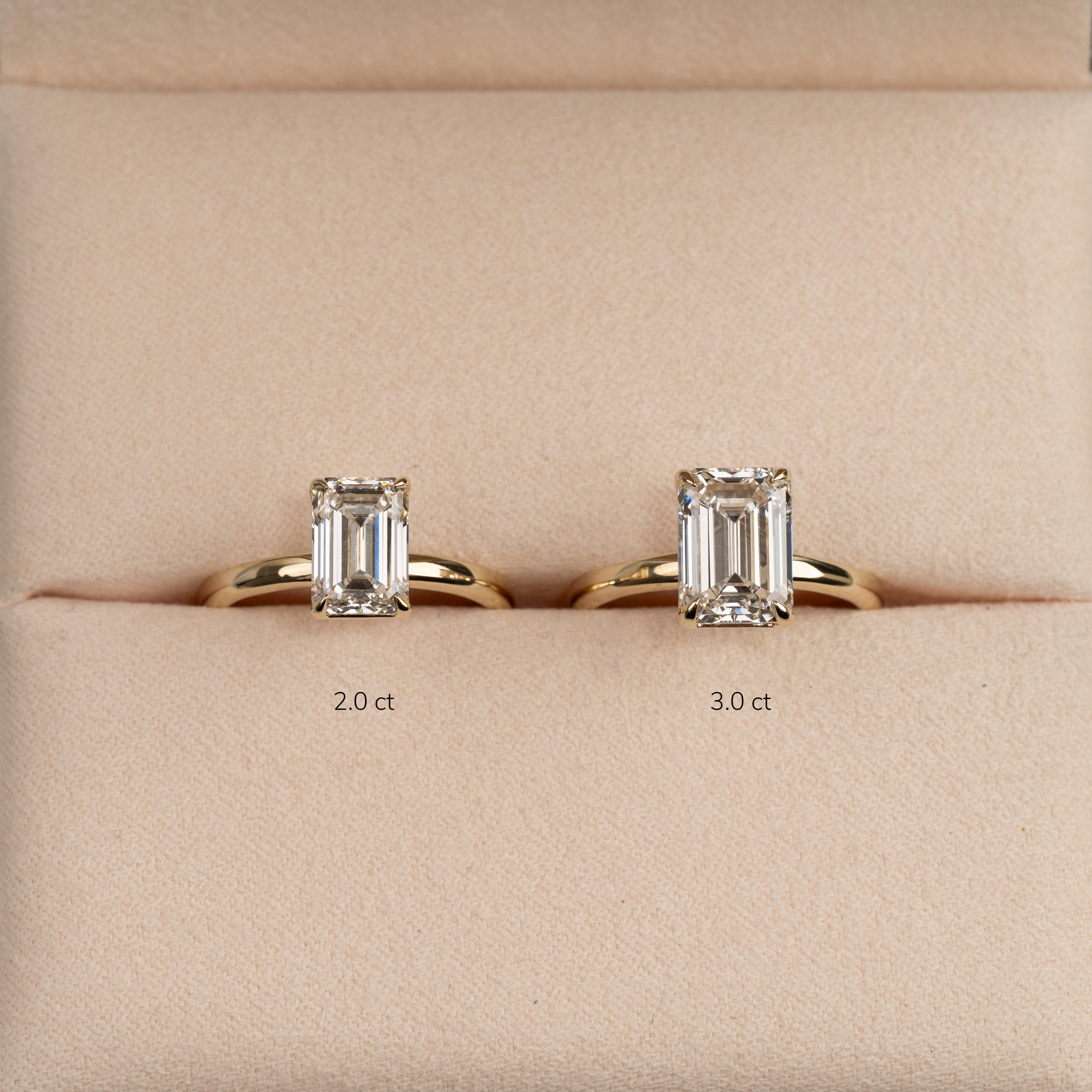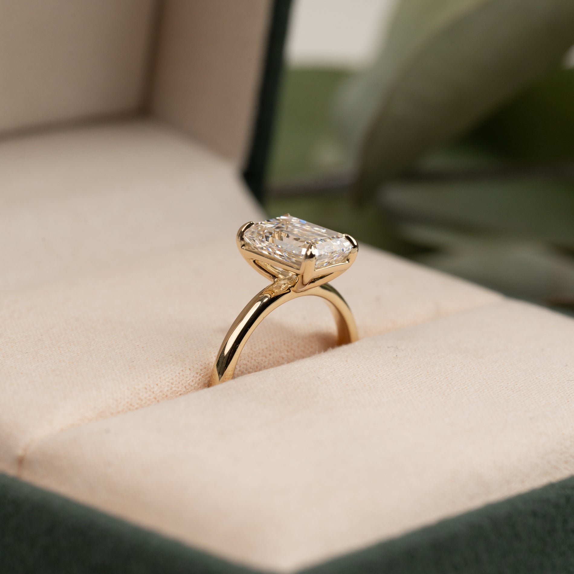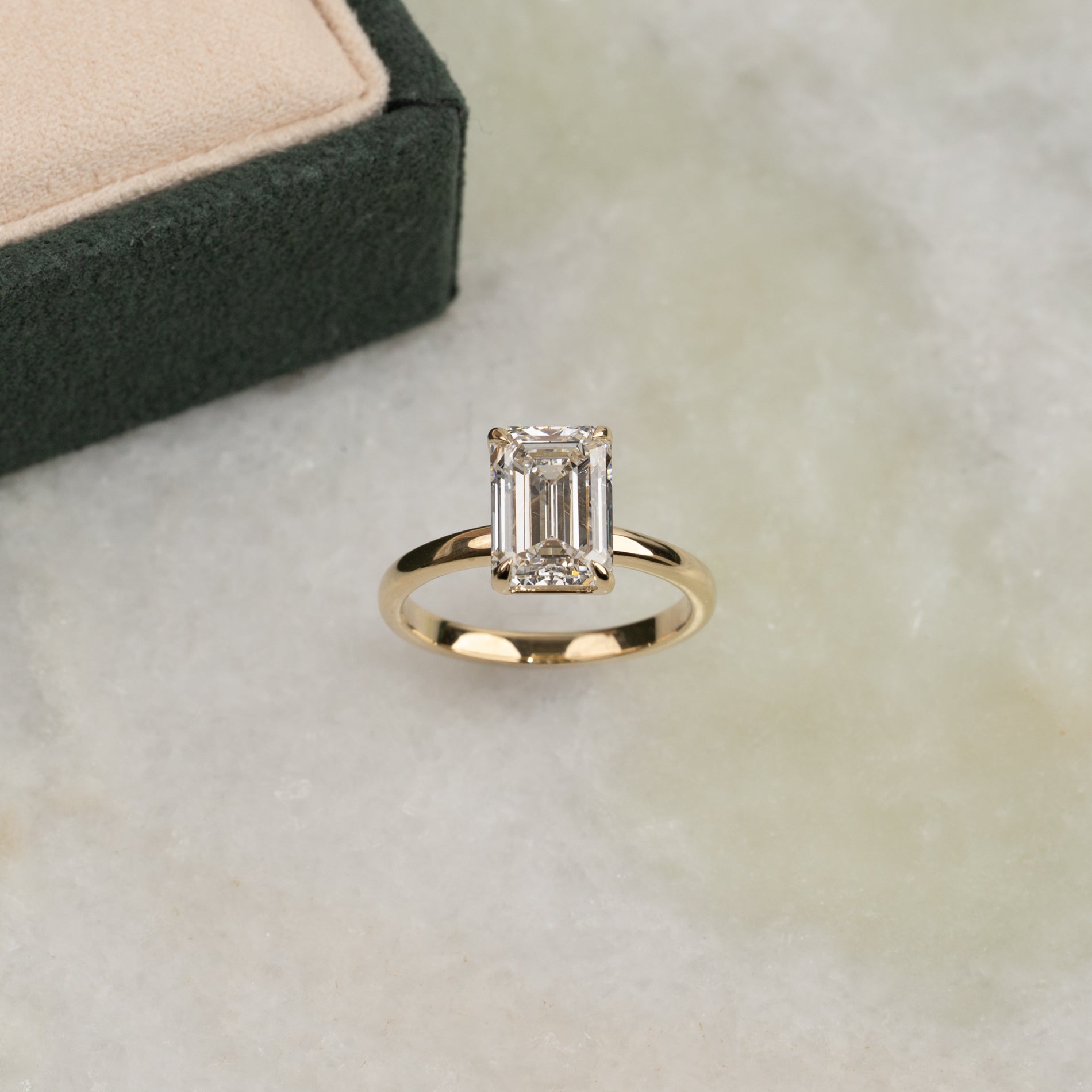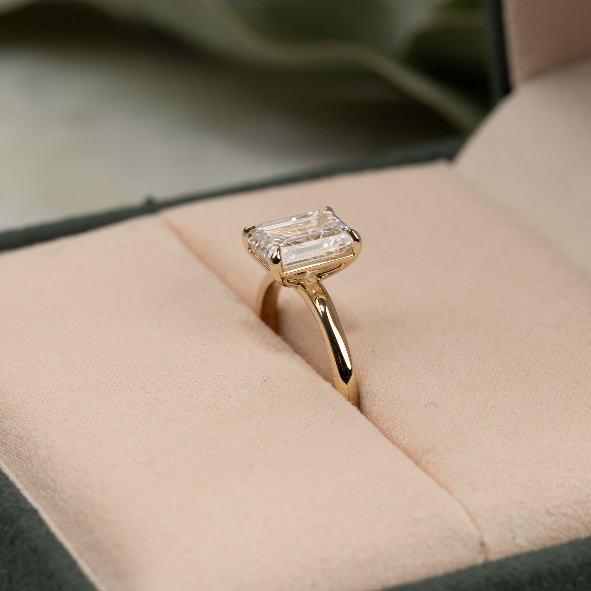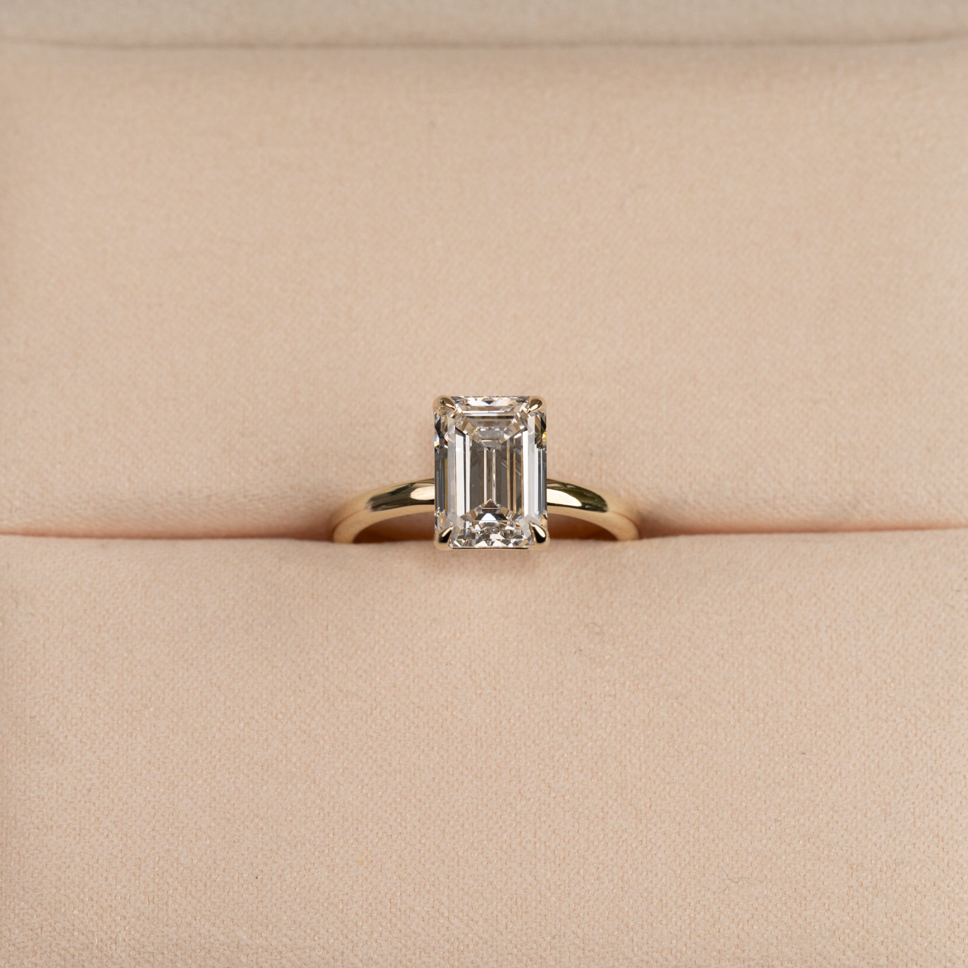 En tidløs ring i 14 karat guld med en smuk emerald‑slebet lab‑grown diamant på 3,0 ct. Diamanten er elegant fattet i en let hævet basket-fatning, der komplimenterer den klare, spejlende glans og den karakteristiske trappefacettering, der kendetegner emerald‑cut.