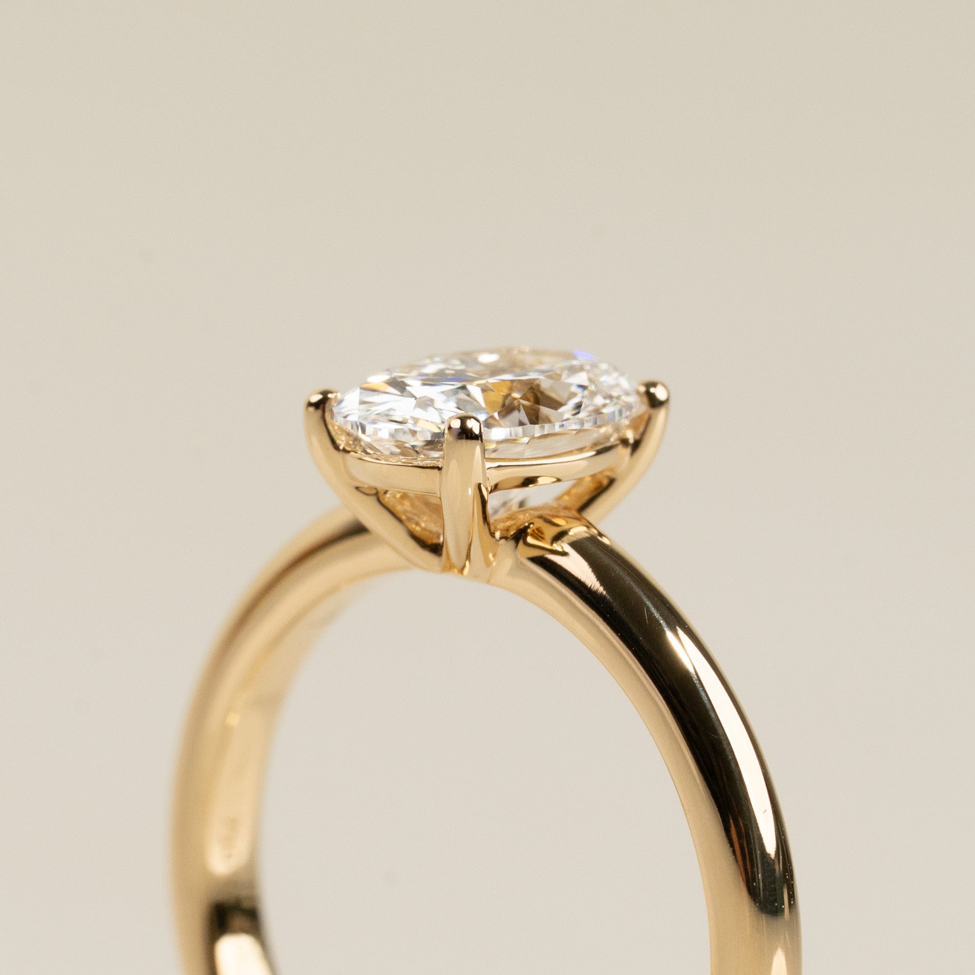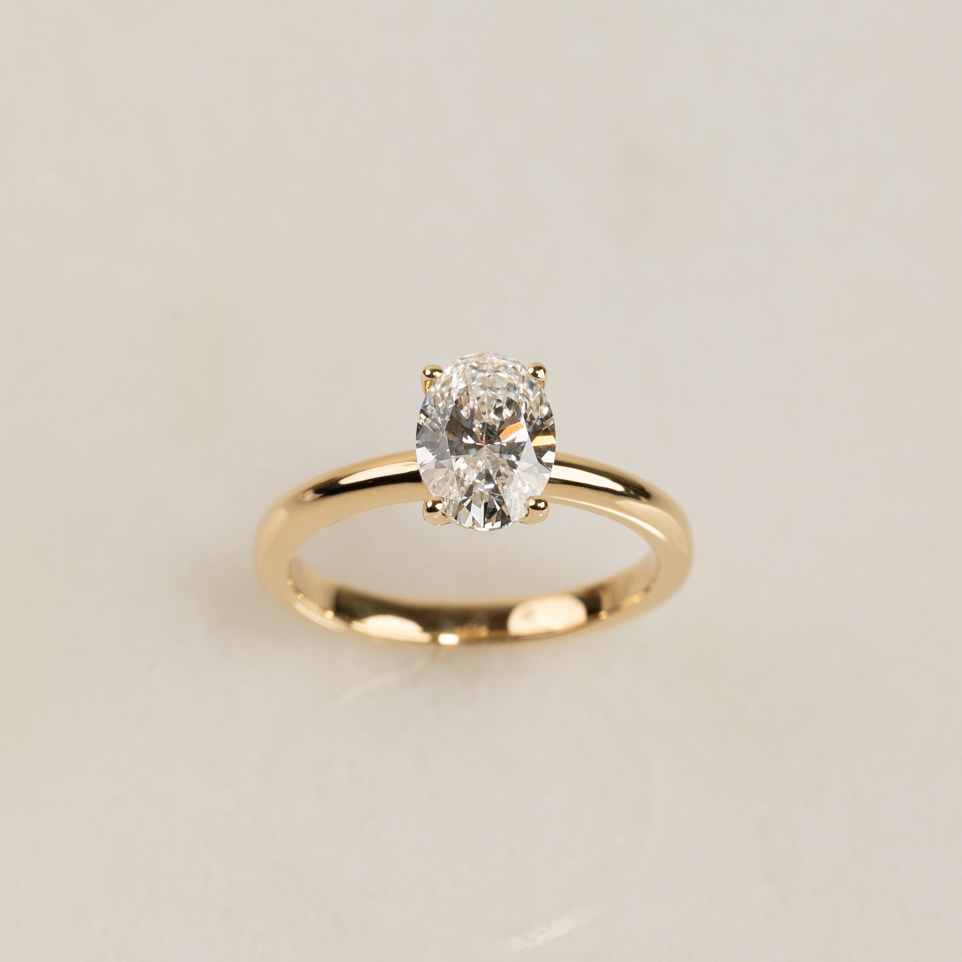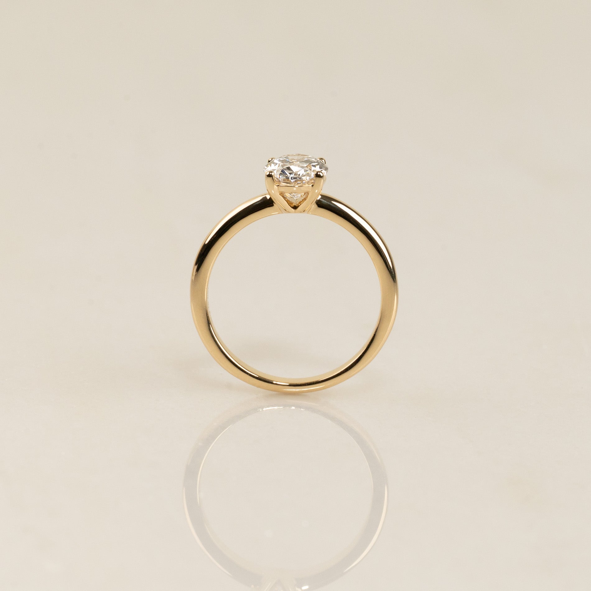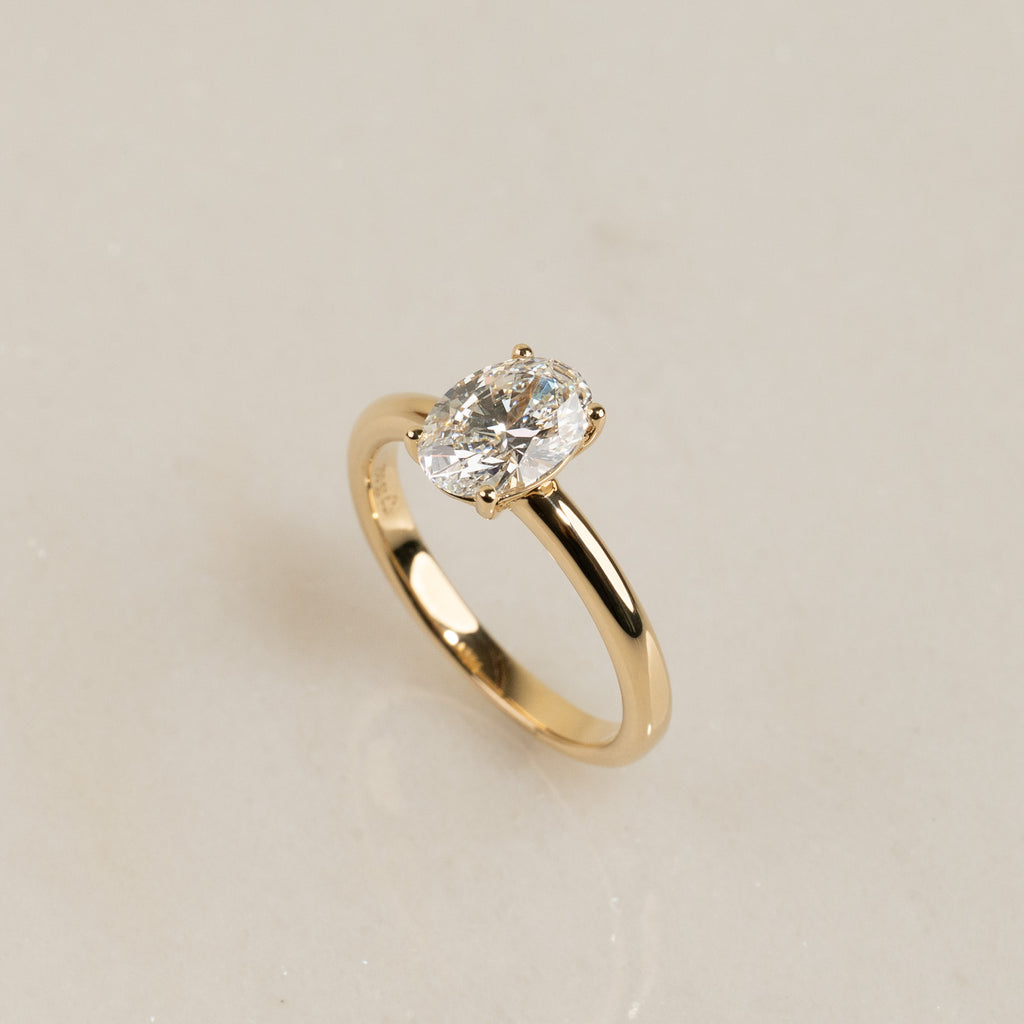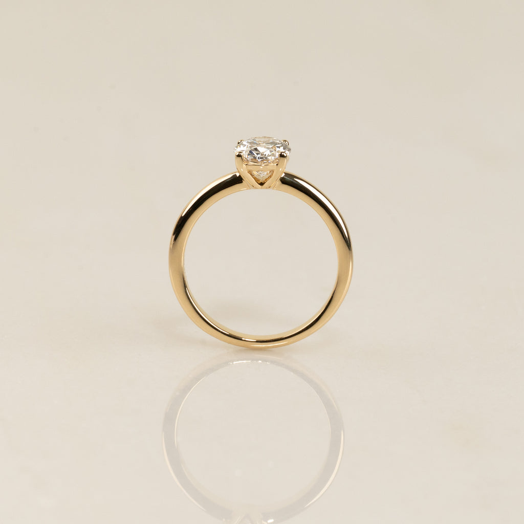 Ringen er fremstillet i 18 karat massivt guld med en 1,25 ct. oval-slebet lab-grown diamant. Kunden ønskede en lav fatning for et tidløst og harmonisk udtryk, hvor diamanten føles naturligt integreret i ringen. Derfor er centerstenen fattet i en elegant, lav basket-fatning, som ikke kun fremhæver diamantens form, men også gør ringen mere komfortabel og modstandsdygtig i hverdagen.