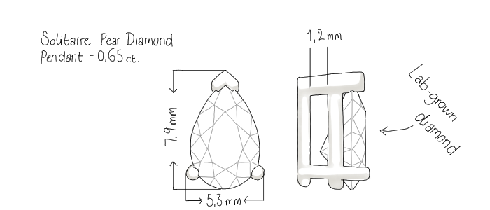 Vedhænget er lavet i 14 karat guld med en lab-grown diamant med en vægt på 0,65 ct., farven E-F(River) og klarheden VVS. Smykket er skabt med omtanke; diamanterne er fremstillet med blandt andet solenergi, og guldet er 100% certificeret genanvendt.