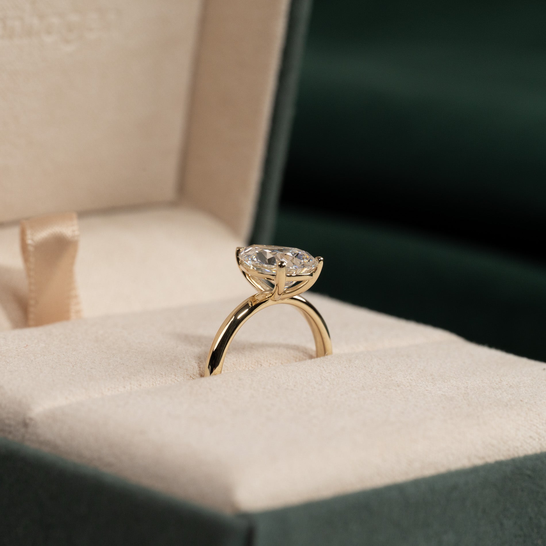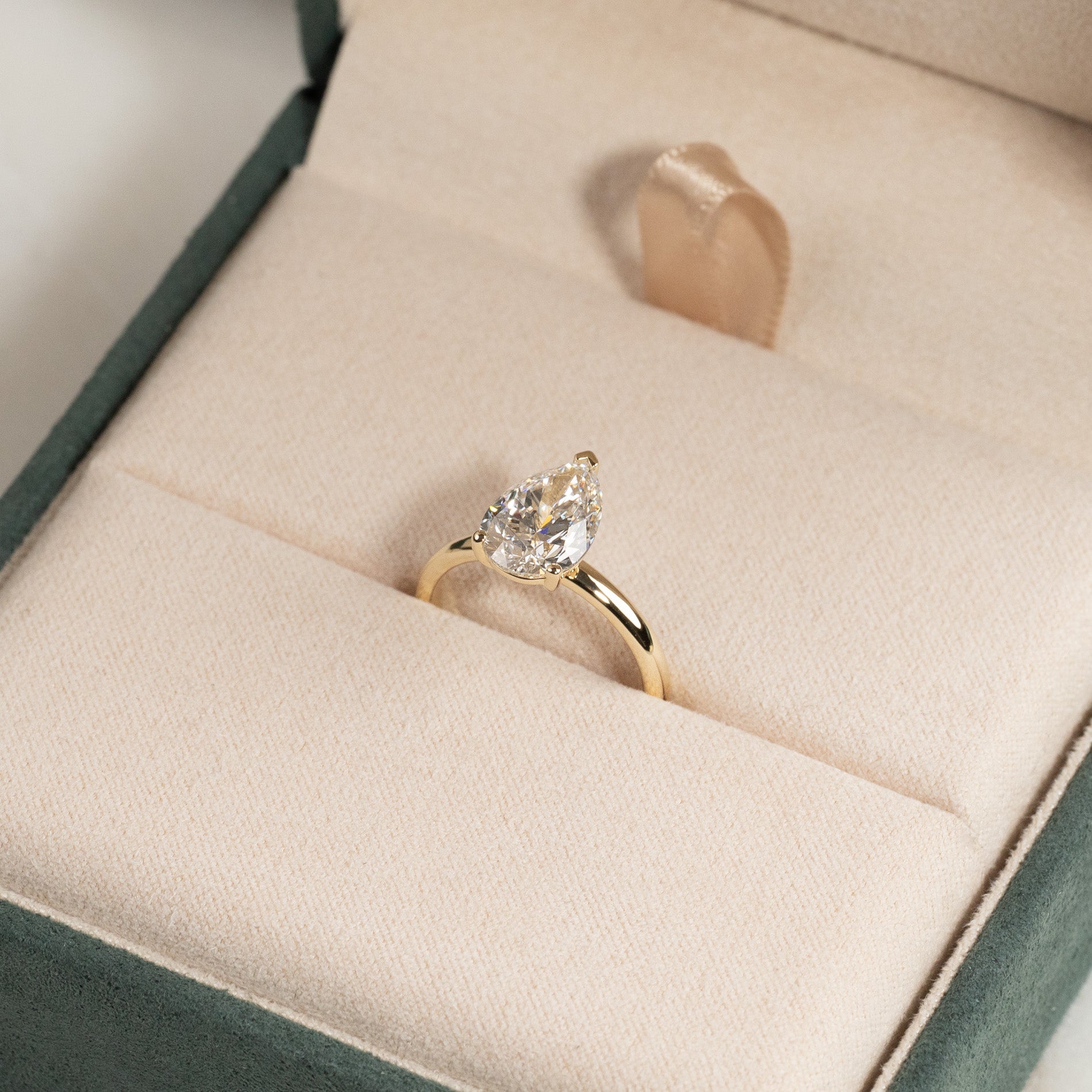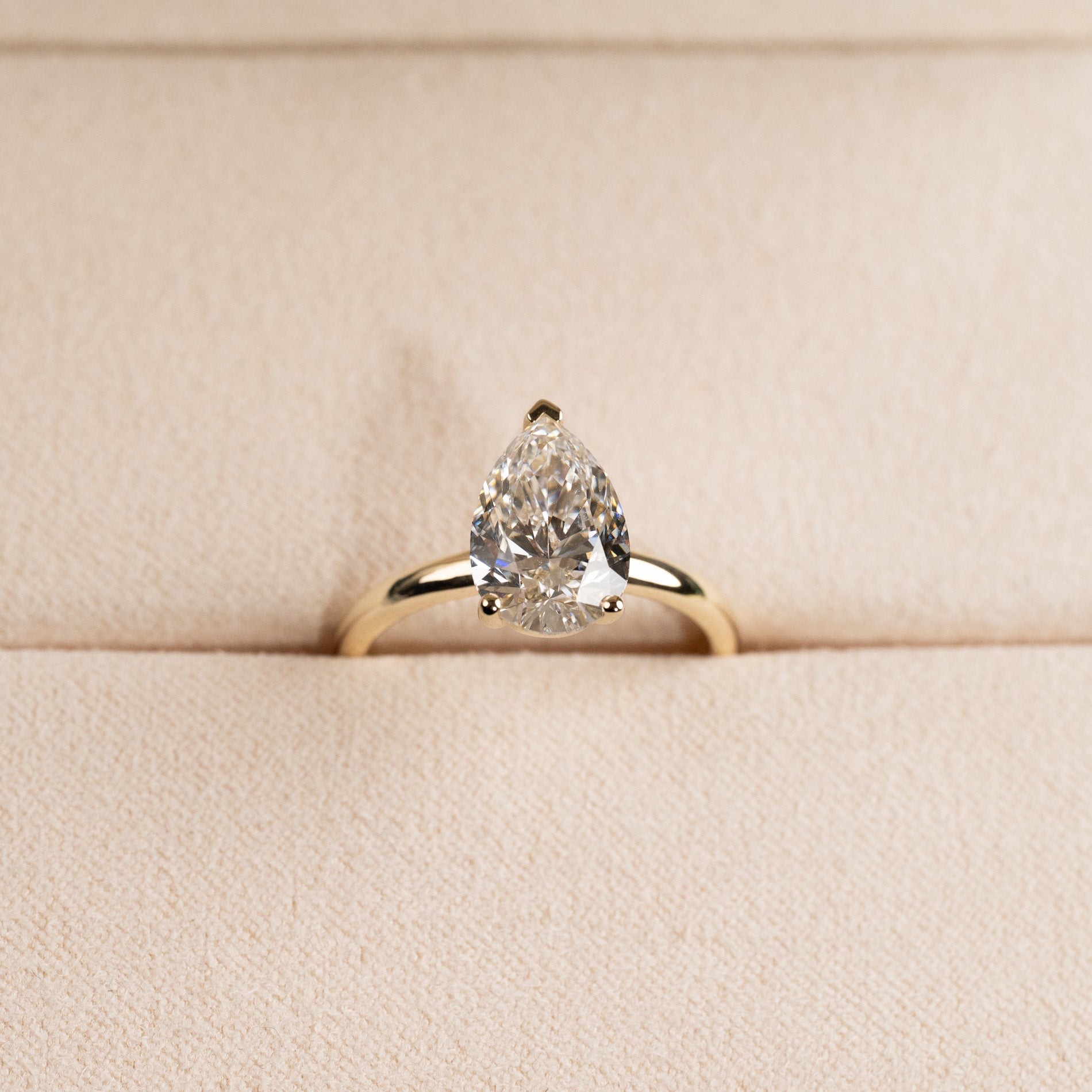 Solitaire ring fremstillet i 14 karat massivt guld med en 2,5 ct. pear-slebet (dråbeformet) lab-grown diamant. Stenen er smukt fattet i en let hævet basket-fatning, der komplimenterer den elegante sten. Ringen er en perfekt cocktailring eller som forlovelsesring.