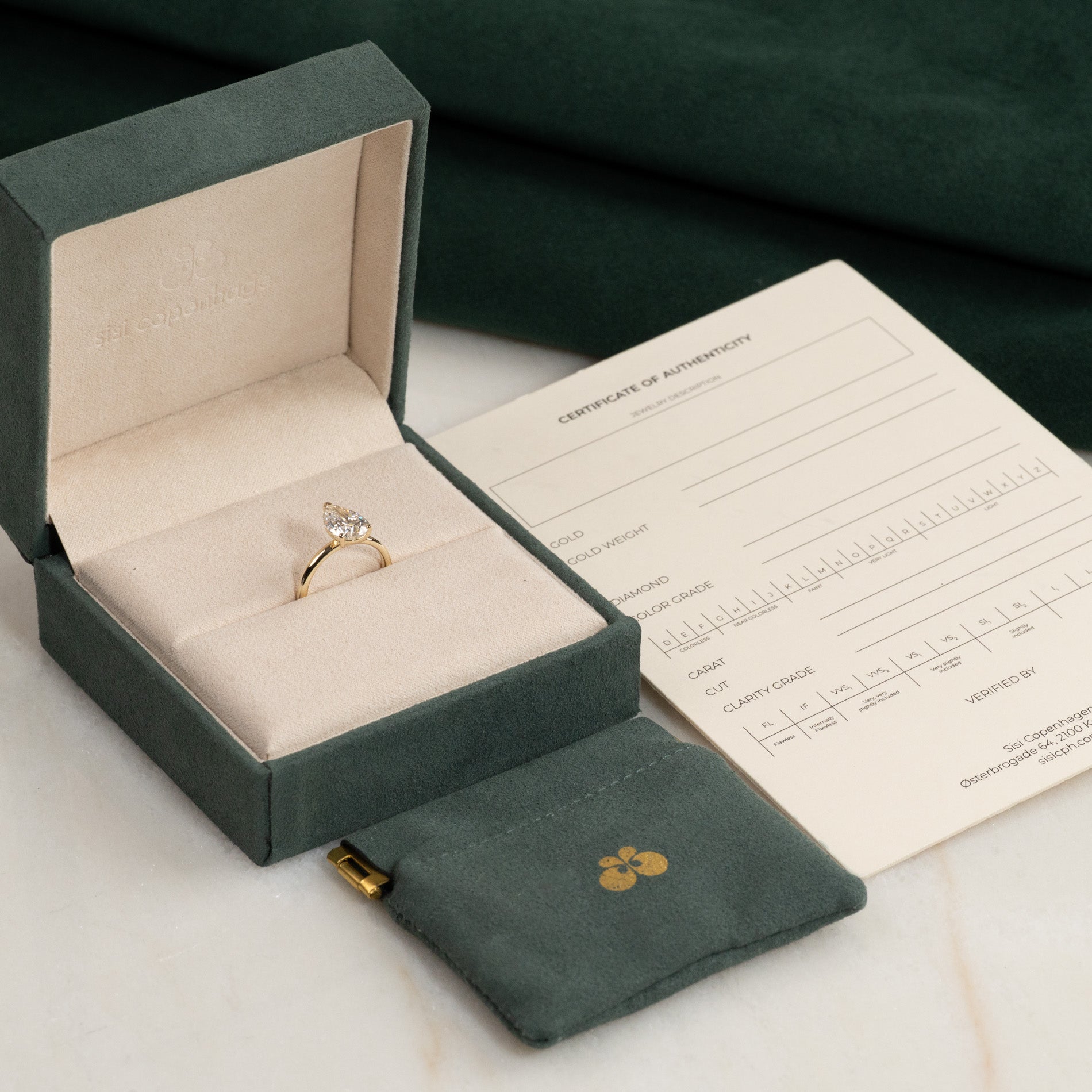 Smykket kommer i vores eksklusive Diamond Collection boks med en flot smykkeæske, et certifikat og en pouch. Boksen kommer med gavebånd og er også perfekt, hvis smykket skal gives som gave.
