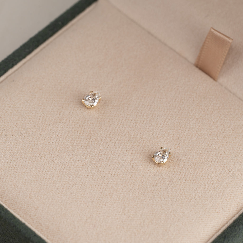 Ørestikkerne er lavet i 14 karat massiv guld med en lab-grown diamanter, der har en vægt på 0,5 ct. (2 x 0,25 ct.) i farven E-F (River) og klarheden VVS. Smykket er skabt med omtanke; diamanterne er fremstillet med blandt andet solenergi, og guldet er 100% certificeret genanvendt.