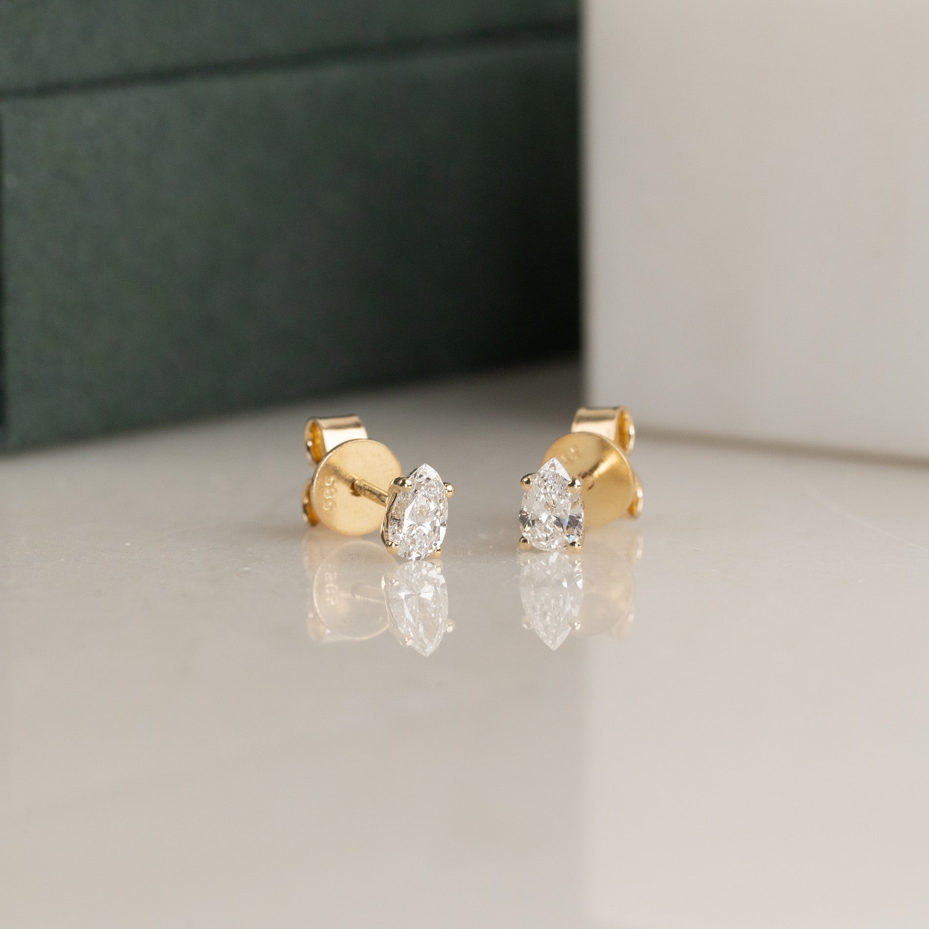 Par ørestikkere med hver en lab-grown diamant i pear-cut (dråbeformet). Den smukke fancy slibning af diamanten giver ørestikkerne et elegant og feminint udtryk, hvis enkelhed gør dem til et tidsløst smykke, der kan bæres til mange anledninger.