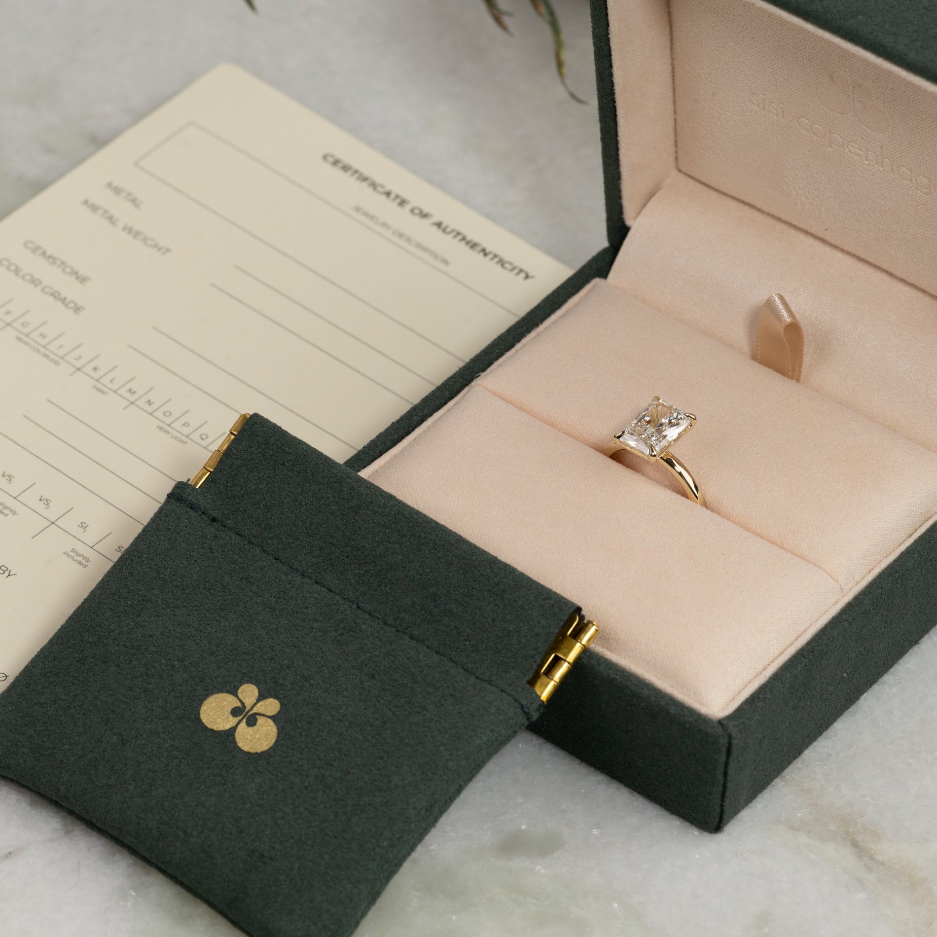 Ringen er lavet i 14 karat massivt guld med en lab-grown diamant på 3,0 ct. i farven E-F (River) og klarheden VVS. Smykket er skabt med omtanke; diamanterne er fremstillet med blandt andet solenergi, og guldet er 100% certificeret genanvendt.
